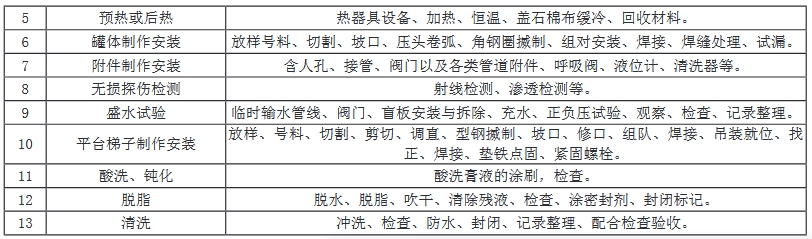 在考慮金屬儲罐制作安裝費用時,首先需要明確大型不銹鋼儲罐的制作安裝所包含的工作內(nèi)容及工序。計算過程應(yīng)能確切反映各施工過程的產(chǎn)品形態(tài)特征。對于一般固定頂立式圓筒形不銹鋼金屬儲罐的制作安裝過程,其施工常規(guī)內(nèi)容整理如下表所示。